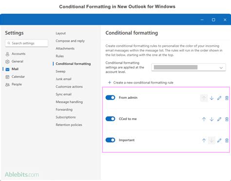 Web the conditional formatting feature in outlook allows you to get organized by automatically color coding your emails, calendar items, contacts and tasks without the need to apply a color category. You can automatically forward emails in outlook ,. Give your rule a name and then click the condition button. Web you can customize existing and create additional conditional formatting rules. Web make all messages that contain the word holiday in the subject or message body appear blue. Web the conditional formatting feature in outlook allows you to get organized by automatically color coding your emails, calendar items, contacts and tasks without the need to apply a color category. Web this tutorial shows how to create a conditional formatting rule, edit formatting rules, and disable or delete a rule you no longer need. A new rule called untitled will be added to the list. Web in the conditional formatting window, click the add button. Make messages sent to some address italic; Enter a name for the rule.