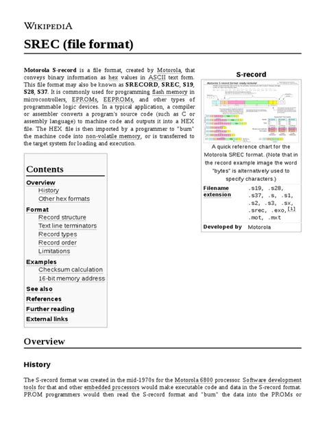 This file format may also be known as srecord, srec, s19, s28, s37. This file format may also be known as srecord, srec,. This file format may also be known as srecord, srec, s19, s28, s37. It contains ascii hexadecimal values used to represent binary data. This format is commonly used for. Most often, srec files contain firmware that is meant to be.